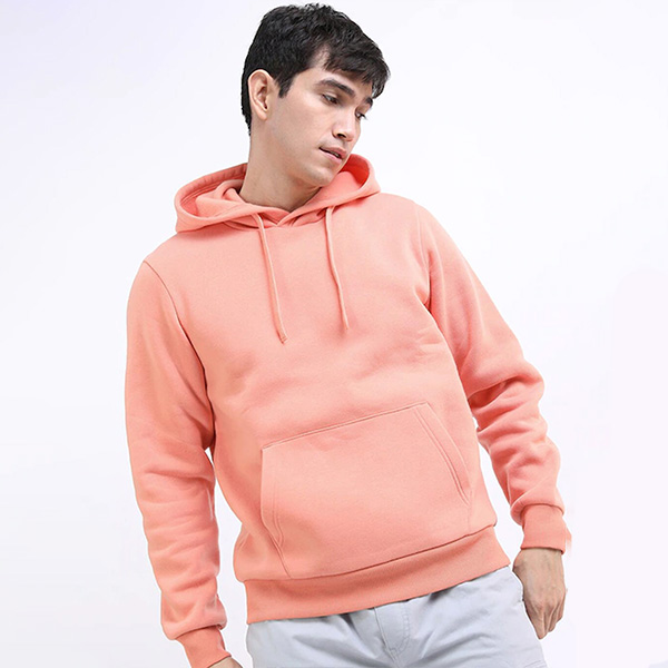 Peach-coloured solid sweatshirt has a hooded, 2 kangaroo pocket pockets, long sleeves, closure, ribbed hem