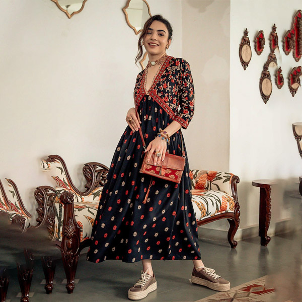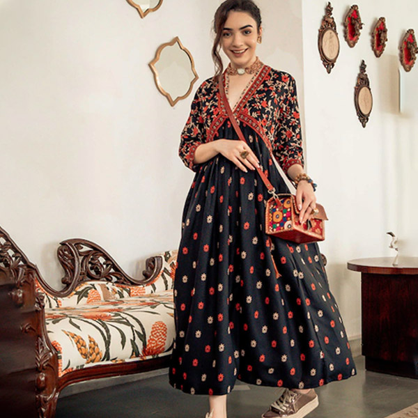 Black & Orange Ethnic Motifs Printed Maxi Dress