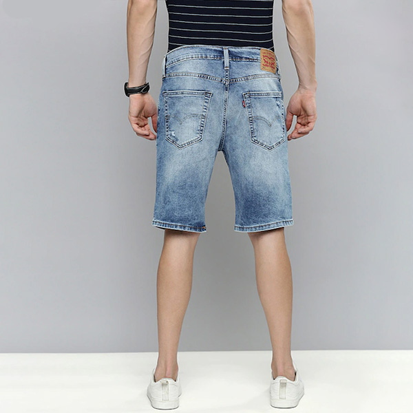 Blue washed mid-rise distressed denim shorts, has 5 pockets, button closure
